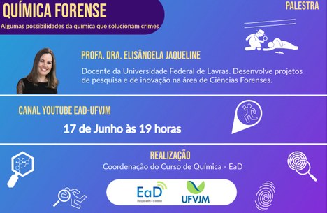 No próximo dia 17 de junho, a coordenação do curso de Química, modalidade a distância da UFVJM, realiza palestra sobre o tema “Química Forense: algumas possibilidades da Química que solucionam crimes”. Em formato on-line, o evento encerra um ciclo de seminários virtuais do primeiro semestre de 2021, realizado pelo curso e, nesta edição, também comemora o Dia Nacional do Químico, celebrado no dia 18 de junho.