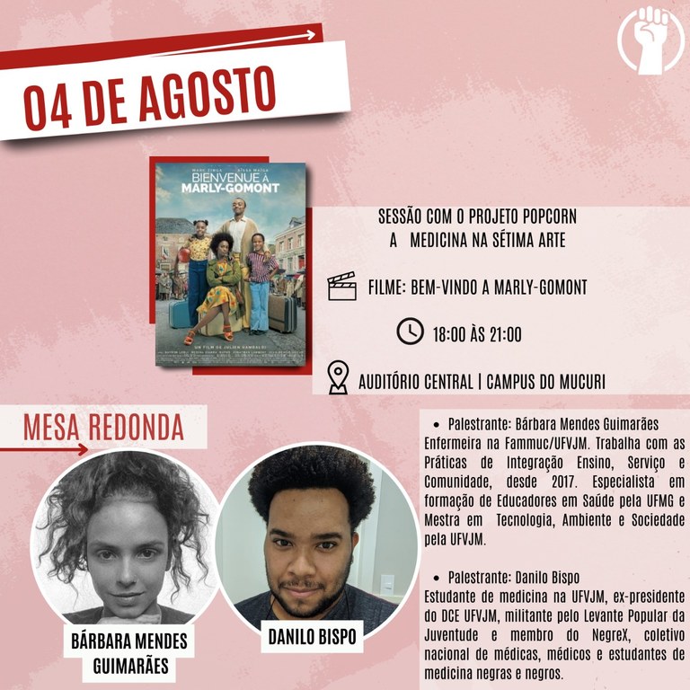 NO DIA 4 DE AGOSTO OCORRERÁ A SESSÃO COM O PROJETO POPCORN: A MEDICINA NA SÉTIMA ARTE, DE 18H ÀS 21H NO AUDITÓRIO CENTRAL DO CAMPUS DO MUCURI. Palestrante: Bárbara Mendes Guimarães. Enfermeira na Fammuc/UFVJM. Trabalha com as Práticas de Integração Ensino, Serviço e Comunidade, desde 2017. Especialista em formação de Educadores em Saúde pela UFMG E Mestra em Tecnologia, Ambiente e Sociedade pela UFVJM. Palestrante: Danilo Bispo. Estudante de medicina na UFVJM, ex-presidente do DcE UFVJM, militante pelo Levante Popular da Juventude e membro do NegreX, coletivo Nacional de médicas, médicos e estudantes de medicina negras e negros.