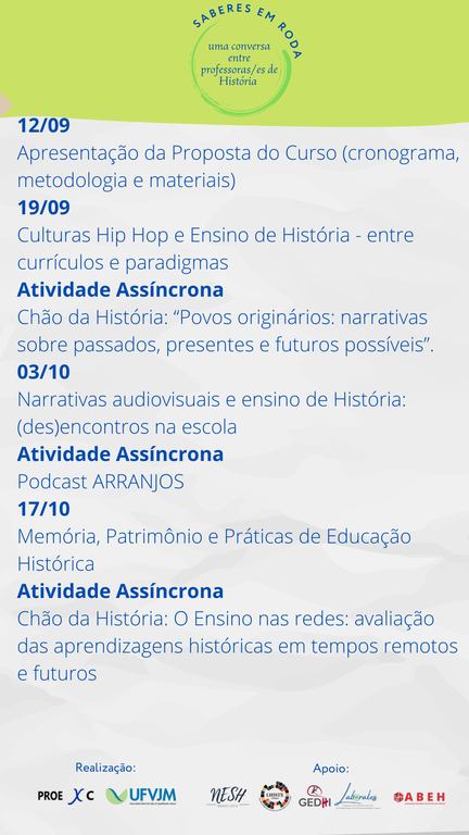 Compõem a programação do evento “Saberes em Roda: uma conversa entre professores/as de História” as seguintes atividades: Apresentação da Proposta do Curso (cronograma, metodologia e materiais), no dia 12 de setembro de 2022, das 17h30 às 19h. Culturas Hip Hop e Ensino de História - entre currículos e paradigmas, no dia 19 de setembro de 2022, das 17h30 às 19h. Atividade Assíncrona: Chão da História: “Povos originários: narrativas sobre passados, presentes e futuros possíveis”. Narrativas audiovisuais e ensino de História: (des)encontros na escola, no dia 3 de outubro de 2022, das 17h30 às 19h. Atividade Assíncrona: Podcast ARRANJOS. Memória, Patrimônio e Práticas de Educação Histórica, no dia 17 de outubro de 2022, das 17h30 às 19h. Atividade Assíncrona: Chão da História: O Ensino nas redes: avaliação das aprendizagens históricas em tempos remotos e futuros.