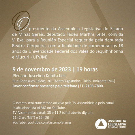 O evento será transmitido ao vivo pela TV Assembleia - canais 35 e 11.2 (sinal aberto digital), 11 (Claro/NET) e 15 (Oi) - e pelo canal institucional da ALMG no YouTube.
