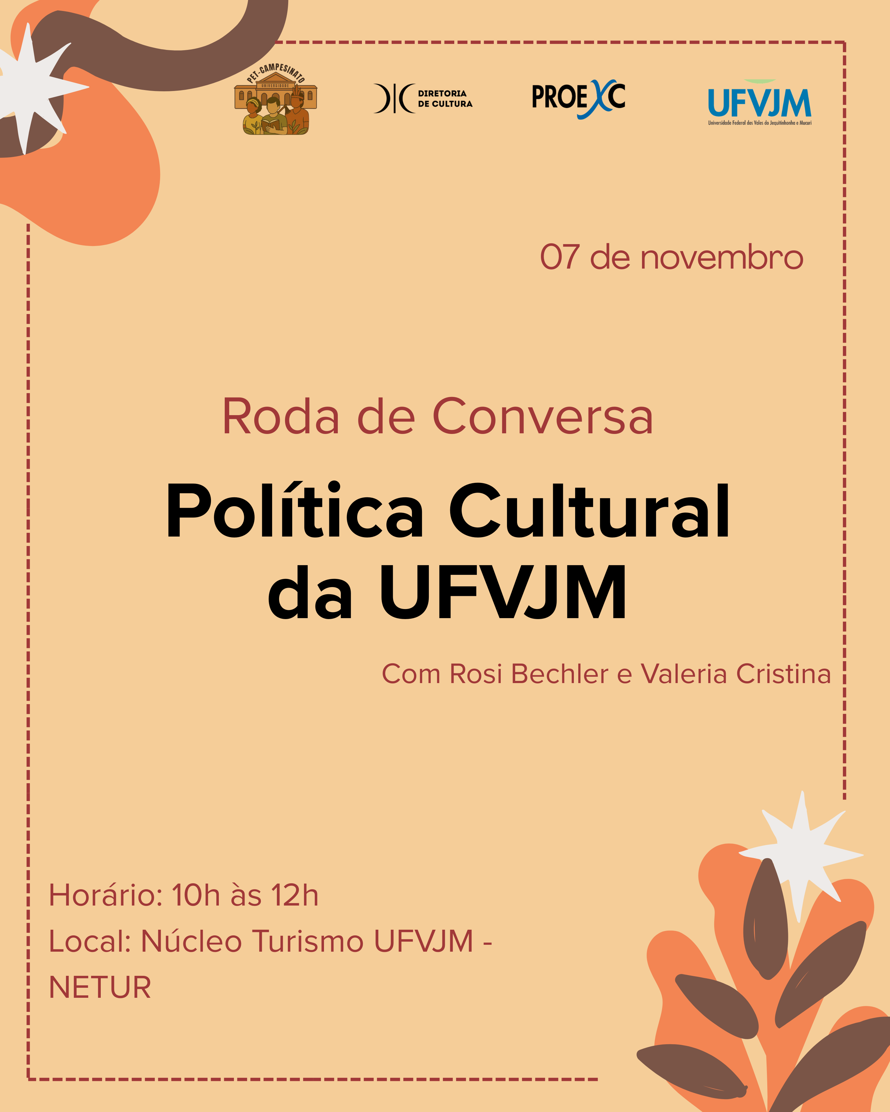 De acordo com a Diretoria de Cultura, a roda de conversa tem como objetivo discutir a política cultural vigente da UFVJM, buscando entender e acolher as demandas. “A roda de conversa surge com a necessidade de repensar e discutir a Política Cultural que rege a Diretoria de Cultura da UFVJM, com o intuito de fazer uma construção ativa e coletiva, para que ela seja viável e condizente com as necessidades da comunidade da UFVJM”, destaca a Diretoria.