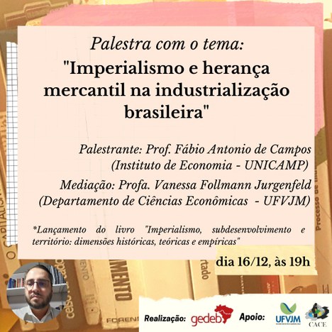 Na próxima quinta (16/12), o Grupo de Estudos em Desenvolvimento Econômico Brasileiro (Gedeb/UFVJM) recebe o professor Fábio Antonio de Campos (Instituto de Economia/Unicamp) para uma palestra com o tema “Imperialismo e herança mercantil na industrialização brasileira”. O evento será realizado às 19h, e contará também com o lançamento do livro Imperialismo, Subdesenvolvimento e Território: dimensões históricas, teóricas e empíricas.
