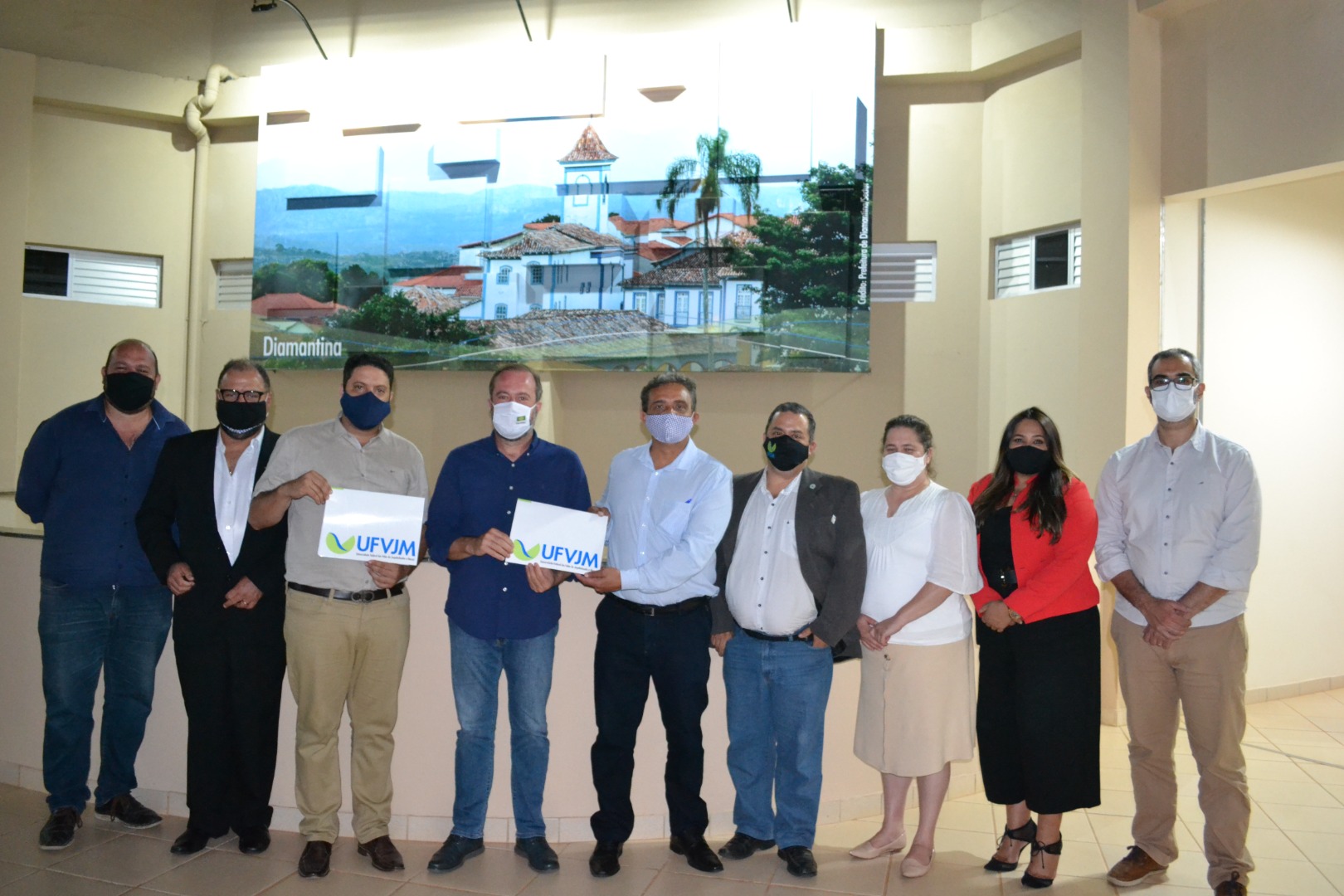 Alcino Costa Neto (Proad); Marcus Guelpeli (Proexc); deputado federal Igor Timo; senador Alexandre Silveira; reitor Janir Soares; vice-reitor Marcus Canuto; Flaviana Verli (Proplan); Fátima Fernandes (AAEI) e Moisés da Silva (Progep)