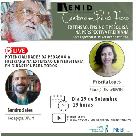 A programação, que começa hoje e vai até dezembro, terá seu encerramento durante a 8ª Semana da Integração: Ensino, Pesquisa e Extensão da UFVJM (Sintegra). As atividades são on-line e têm como temática o patrono da educação brasileira, Paulo Freire, em homenagem ao seu centenário.