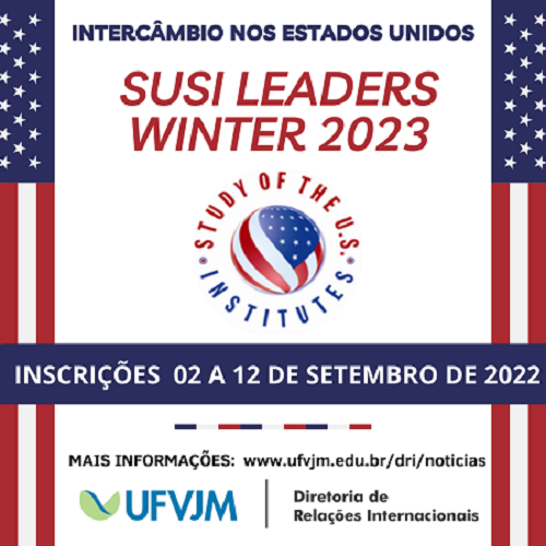 A Diretoria de Relações Internacionais torna público o edital para pré-seleção e indicação de um estudante de graduação para participar de processo seletivo para o programa de intercâmbio SUSI Leaders Winter 2023. As incrições podem ser realizas no período de 2 a 12 de setembro via formulário eletrônico. Para obter mais informações acesse o site da Diretoria de Relações Internacionais em: http://www.ufvjm.edu.br/dri/noticias/2598-susi-2023.html.