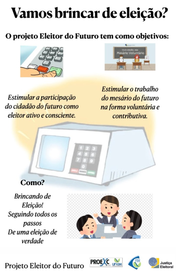 Cartaz do projeto: “Vamos brincar de eleição? O projeto Eleitor do Futuro tem como objetivos: estimular a participação do cidadão do futuro como eleitor ativo e consciente e estimular o trabalho do mesário do futuro na forma voluntária e contributiva. Como? Brincando de eleição! Seguindo todos os passos de uma eleição de verdade.”