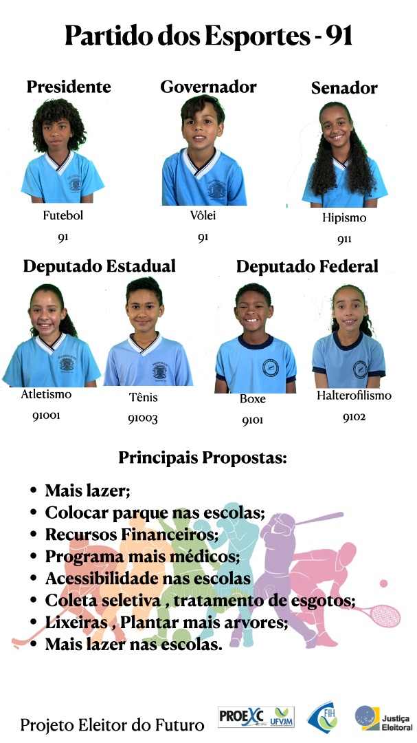Partido dos Esporte-91. Principais propostas: mais lazer, colocar parque nas escolas, recursos financeiros, programa mais médicos, acessibilidade nas escolas, coleta seletiva, tratamento de esgotos, lixeiras, plantar mais árvores e mais lazer nas escolas.