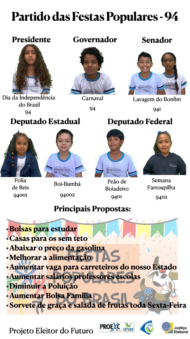 Partido das Festas Populares-94. Principais propostas: bolsas para estudar, casas para os sem teto, abaixar o preço da gasolina, melhorar a alimentação, aumentar a vaga para carreteiros do nosso estado, aumentar salários dos professores das escolas, diminuir a poluição, aumentar o Bolsa Família, sorvete de graça e salada de frutas toda sexta-feira.