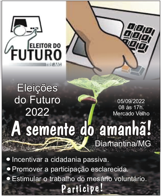 Cartaz: “Eleição do Futuro 2022. A semente do amanhã! Diamantina/MG. Incentivar a cidadania passiva, promover a participação esclarecida e estimular o trabalho do mesário voluntário. Participe! 5 de setembro de 2022, de 8 às 17 horas, no Mercado Velho.”