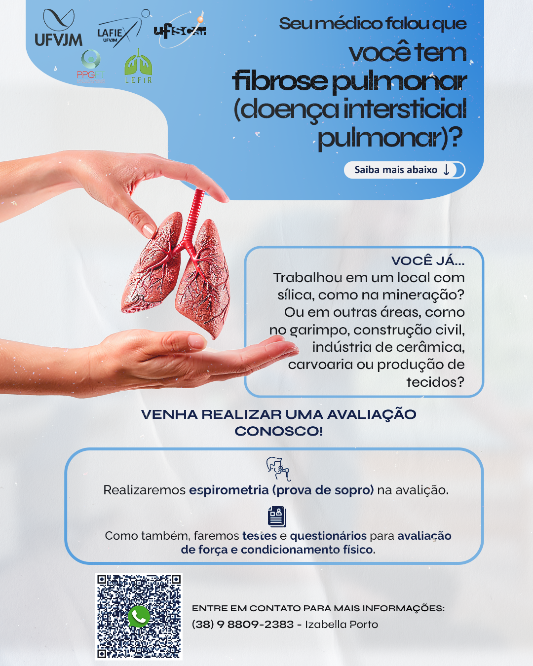 O Departamento de Fisioterapia da UFVJM, em Diamantina (MG), está selecionando voluntários com diagnóstico de fibrose pulmonar ou outra doença intersticial pulmonar para participar de pesquisa realizada pela universidade. Podem participar homens e mulheres, a partir de 18 anos. Os participantes serão avaliados presencialmente na UFVJM (Campus JK) e, ao final, receberão um relatório das avaliações e o resultado da espirometria (exame de sopro). As pessoas interessadas em participar da pesquisa devem enviar um e-mail para os endereços izabella.porto@ufvjm.edu.br e pesquisaufvjmdpi@gmail.com ou enviar uma mensagem para o número de WhatsApp (38) 988092383.