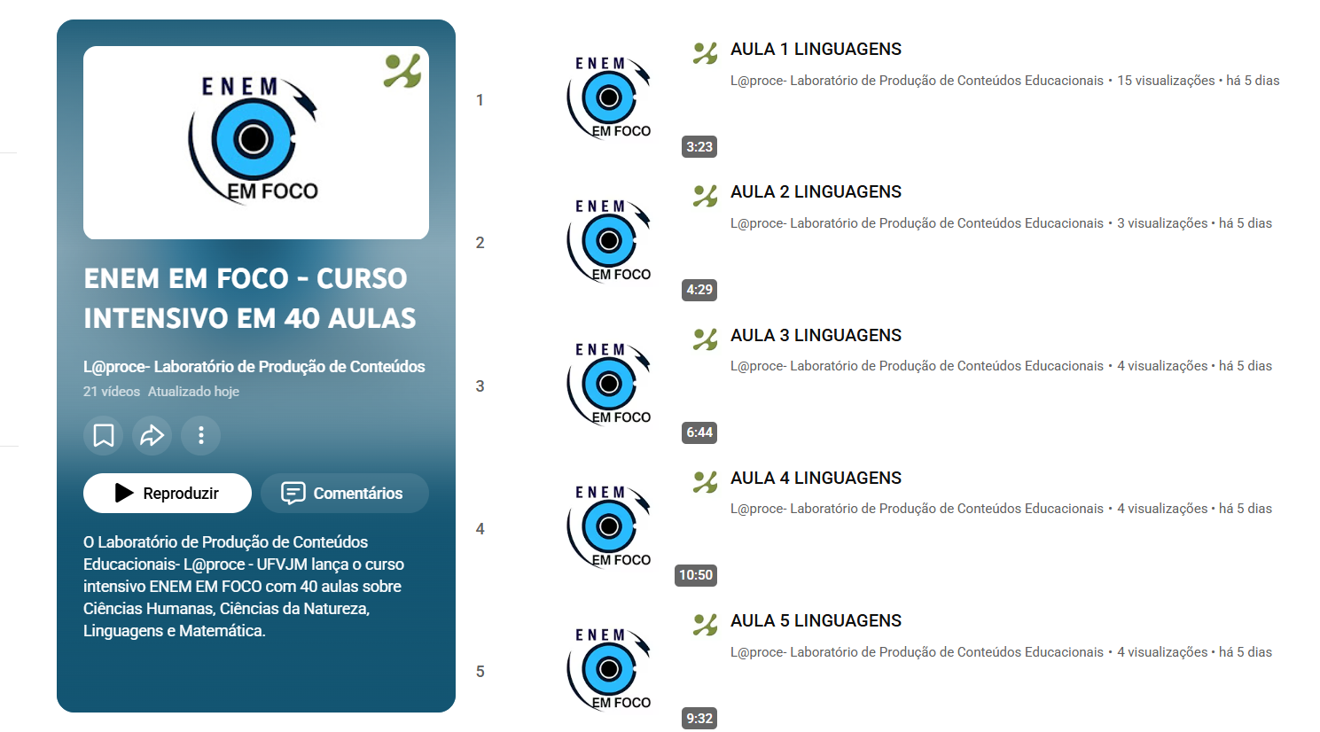 O Laboratório de Produção de Conteúdos Educacionais (Laproce), em parceria com a Diretoria de Educação a Distância (Dead), da UFVJM, lançou o curso intensivo gratuito “Enem em Foco”, um conjunto de 40 videoaulas voltadas à preparação para o Exame Nacional do Ensino Médio (Enem). As videoaulas abrangem conteúdos de Ciências Humanas, Ciências da Natureza, Linguagens e Matemática, e contam com a participação de estudantes dos cursos de graduação da universidade.