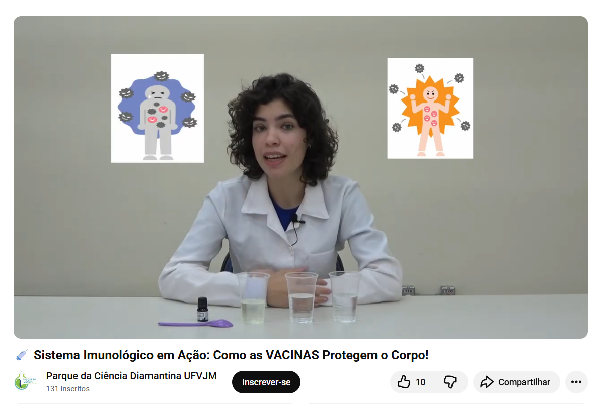 De acordo com Everton, foram produzidos quatro vídeos, que serão publicados semanalmente no canal, sendo que o primeiro já está disponível hoje (17/10), sobre o tema “Sistema Imunológico em Ação: como as vacinas protegem o corpo”. “Gravamos vídeos de experimentos simples, voltados para professores e alunos da educação básica, para que eles possam até replicar nas escolas, porque utilizam material do dia a dia e nada perigoso”.