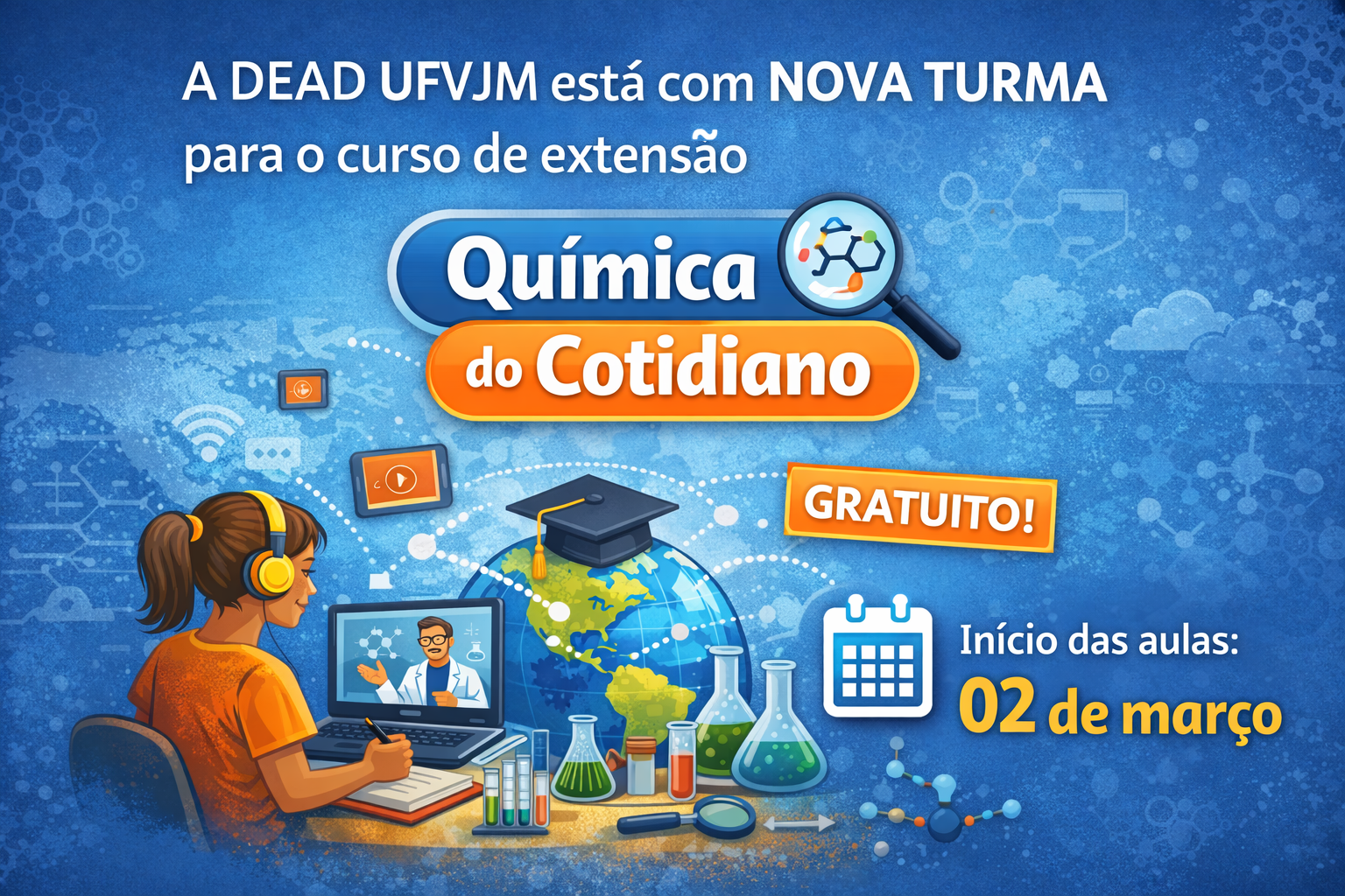 A Diretoria de Educação Aberta e a Distância (Dead) da UFVJM abriu inscrições para uma nova turma do curso gratuito de extensão “Química do Cotidiano”, que terá início no próximo dia 2 de março. O curso, com carga horária total de 60 horas, é ofertado totalmente a distância e foi elaborado com o objetivo de apresentar conceitos essenciais da química aplicados ao dia a dia, promovendo a compreensão dessa ciência de forma contextualizada e acessível. Para se inscrever gratuitamente, os interessados devem acessar o ambiente de cursos da DEAD/UFVJM, e caso ainda não possuam cadastro, é preciso fazê-lo no momento da inscrição.