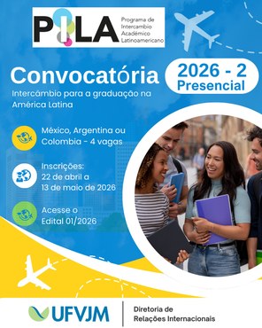 A UFVJM, por intermédio da Diretoria de Relações Internacionais (DRI), torna pública a abertura de processo seletivo para participação em mobilidade acadêmica internacional em instituições de ensino superior latino-americanas. A mobilidade será oportunizada por meio do Programa de Intercâmbio Acadêmico Latino-Americano (Pila) nos termos da Convocatória PILA 2026-2, modalidade presencial.