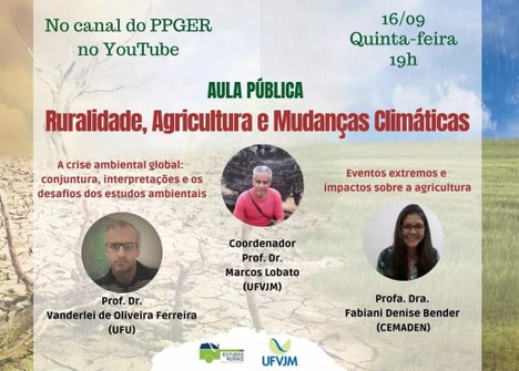 Hoje (16/9), o Programa de Pós-Graduação em Estudos Rurais (PPGER) da UFVJM promoverá aula pública com a temática “Ruralidade, agricultura e mudanças climáticas”. O evento será realizado em formato on-line, com transmissão às 19h, no canal do programa no YouTube, com acesso aqui. A aula é aberta a todos os interessados no tema, público acadêmico e sociedade em geral.