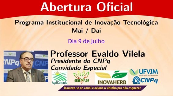 A Pró-Reitoria de Pesquisa e Pós-Graduação (PRPPG) realizará, amanhã (9/7), live de abertura oficial do Programa Institucional de Inovação Tecnológica (MAI-DAI) na UFVJM. O evento será às 10h e contará com a participação do presidente do Conselho Nacional de Desenvolvimento Científico e Tecnológico (CNPq), Evaldo Vilela. A live será transmitida pelo canal do Grupo de Estudos Genética e Biotecnologia Florestal da UFVJM no YouTube, que pode ser acessado aqui.