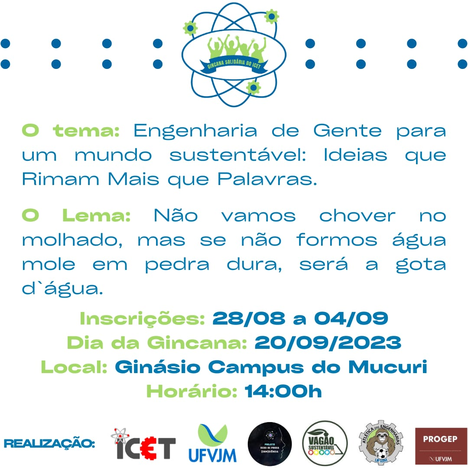 Com o tema “Engenharia de gente para um mundo sustentável: ideias que rimam mais que palavras” e com o lema “Não vamos chover no molhado, mas se não formos água mole em pedra dura, será a gota d`água”, vem aí a 1ª Gincana Solidária do Icet! O evento é direcionado à comunidade acadêmica do Instituto, e as inscrições devem ser feitas até o dia 4 de setembro. O encontro final é no dia 20 de setembro, às 14 horas, no Ginásio do Campus do Mucuri, em Teófilo Otoni.