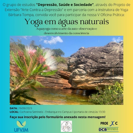 Por meio do projeto de extensão Arte Contra a Depressão, o grupo de estudos Depressão, Saúde e Sociedade convida todos os interessados a participar da sua quinta oficina prática, com o tema “Yoga em águas naturais: aquayoga como a arte da auto-observação e desenvolvimento da consciência”, realizada em parceria com a instrutora de Yoga Bárbara Tompa.